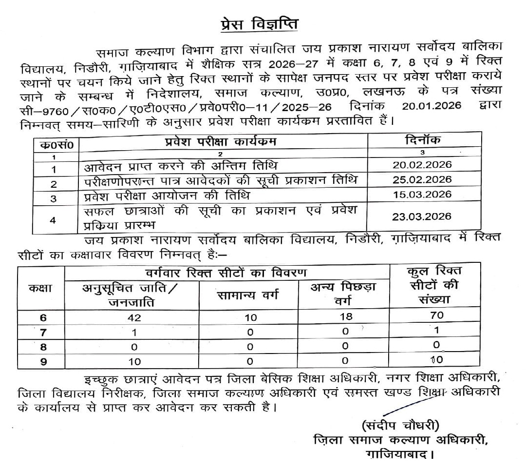 गाजियाबाद( 21 जनवरी 2026) समाज कल्याण विभाग के संचालित जय प्रकाश नारायण सर्वोदय बालिका विद्यालय, निडौरी (गाज़ियाबाद) ने शैक्षणिक सत्र 2026-27 के लिए कक्षा 6, 7, 8 और 9 में रिक्त सीटों पर प्रवेश के लिए आवेदन आमंत्रित किए हैं। कक्षा 6: कुल 70 सीटें (SC/ST- 42, सामान्य- 10, OBC- 18),कक्षा 7: 01 सीट (SC वर्ग),कक्षा 9: 10 सीटें (SC वर्ग)